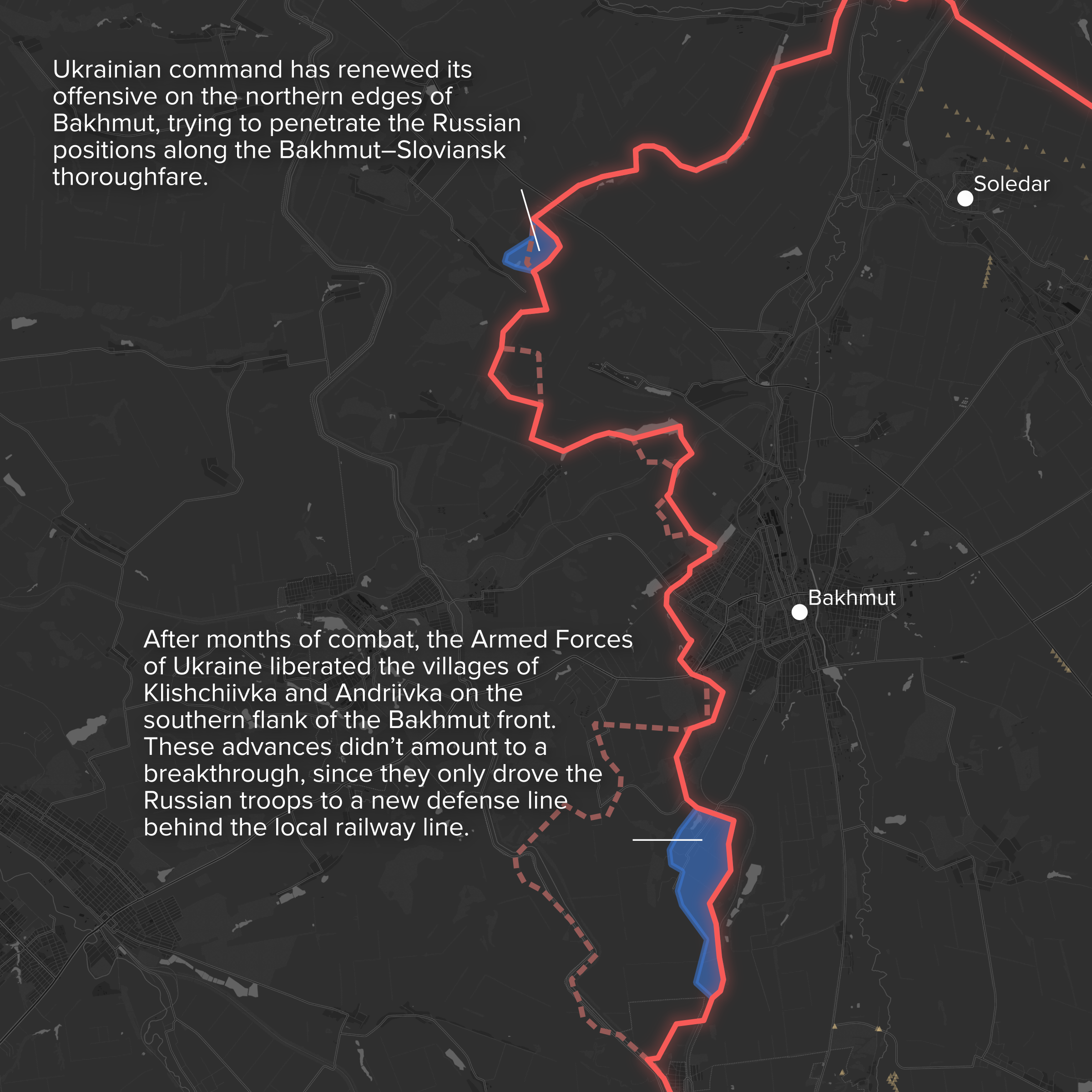 - Liberating Klishchiivka and Andriivka does not amount to a breakthrough on this front, since the Russian troops have merely retreated to a new defense line behind the Bakhmut–Horlivka railway. Now, the AFU are faced with a task of rupturing several defense lines in a row: the first one along the railroad, the second in the hills east of the city, and the third even further east, along the Bakhmut–Horlivka highway. Besides, the Russian grouping’s main supply line in this theater is the Popasna–Bakhmut thoroughfare, located away from all the action, on the other side of Bakhmut. In other words, recapturing the two villages was a necessary but not sufficient condition for the Ukrainian army’s success on the Bakhmut front.
