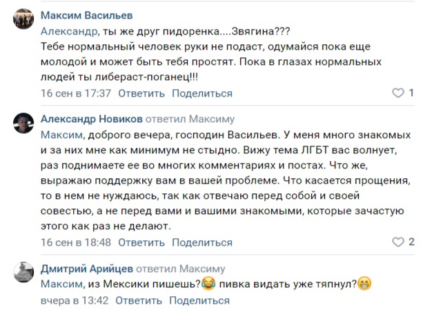 В частности, Максим Васильев нарушил п. 1.3. Постановления Курской областной думы от 21.02.2018 № 292-VI ОД «О правилах депутатской этики в Курской областной думе», а именно: унизил мое человеческое достоинство посредством публичного оскорбления, а также Александра. В нарушение п. 1.4. Васильев не воздержался от заявлений, порочащих его избирателей и компрометирующих их. В нарушение п. 3.6. Васильев с использованием интернета допустил необоснованные обвинения в мой адрес. На основании пункта 3.7. я требую обязать Васильева признать некорректность своего высказывания, что я "п*******к" и "ненормальный человек" и принести мне публично извинения. Также требую объявить Васильеву предупреждение о недопустимости нарушений правил депутатской этики и разместить информацию о фактах нарушения Правил в интернете либо опубликовать в СМИ на основании п. 5.15