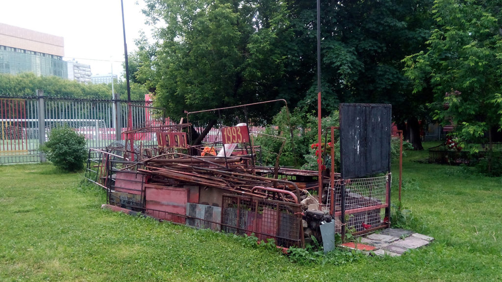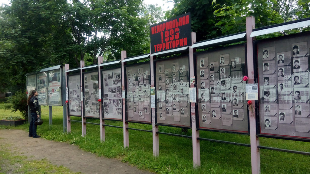 В 1995-м в Госдуме Петухов говорил еще и о том, как важно достойно увековечить память погибших. Он предлагал «воздвигнуть святилища» на месте массовых расстрелов у «Останкино» и Белого дома. Храмы так и не были построены — и вообще до сих пор существует только один памятник, посвященный этим событиям, — стихийный мемориал рядом со стадионом «Красная Пресня». Сперва участники событий приносили элементы противотанковых укреплений и куски колючей проволоки, которой было обнесено здание парламента. Затем группа активистов под руководством художника Андрея Подшивалова стала ухаживать за мемориалом. Они назвали себя «Вахта памяти»: установили православный крест, развесили на заборе портреты погибших.