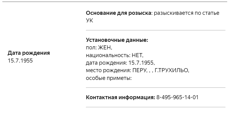 Карточка розыска судьи Ибаньес Каррансы из базы МВД