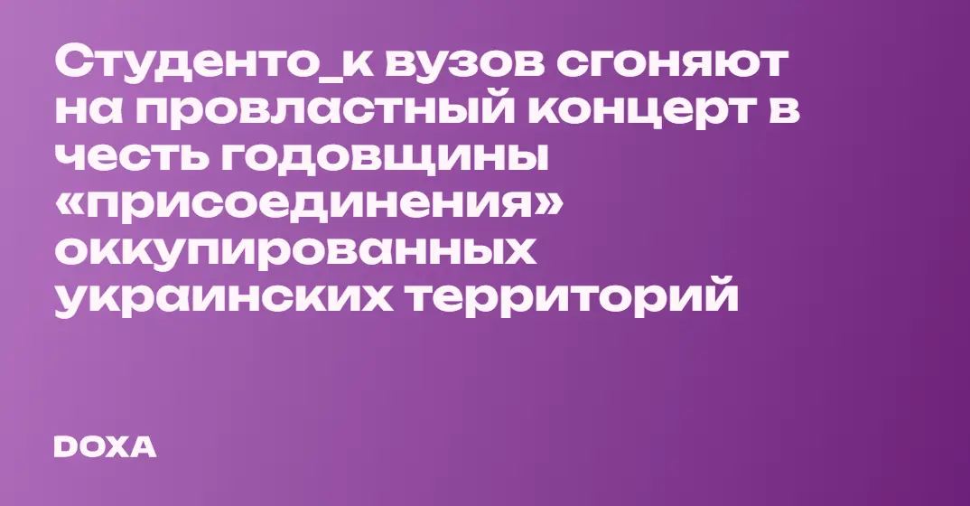 В Московском государственном университете геодезии и картографии (МИИГАиК) учащихся заставляют посетить концерт в честь годовщины «присоединения» оккупированных территорий Украины, об этом DOXA сообщили студент_ки университета. Сначала всех старост срочно вызвали в деканат без указания причины. После чего ответственная за организационно-воспитательную работу факультета сообщила, что требуется не менее 15 человек для оформления именных билетов, сообщают учащиеся.