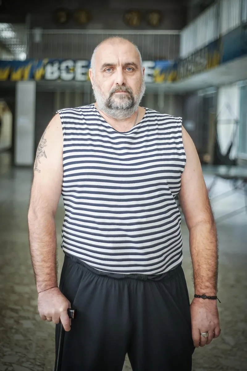 Олег Татаренко — почти карикатурный одессит, одетый в сине-белую морфлотовскую тельняшку. Ему слегка за пятьдесят, и как коренной одессит он предсказуемо получил позывной «Одесса». Правой рукой он опирается на деревянную трость. Для рукопожатия я неосознанно подаю неудобную руку и тут же, понимая свою глупость, опускаю. Он берет трость в другую руку, переносит вес и, шепча «ничего-ничего», протягивает ладонь в ответ. Одесса часто смотрит в глаза, но говорит со мной почти шепотом. Мне приходится наклоняться почти впритык, чтобы записать его слова на диктофон. Наше общение немного напоминает танец — после каждого вопроса он делает шаг в сторону, будто избегая контакта, и останавливается, только когда к нему подходят собаки.