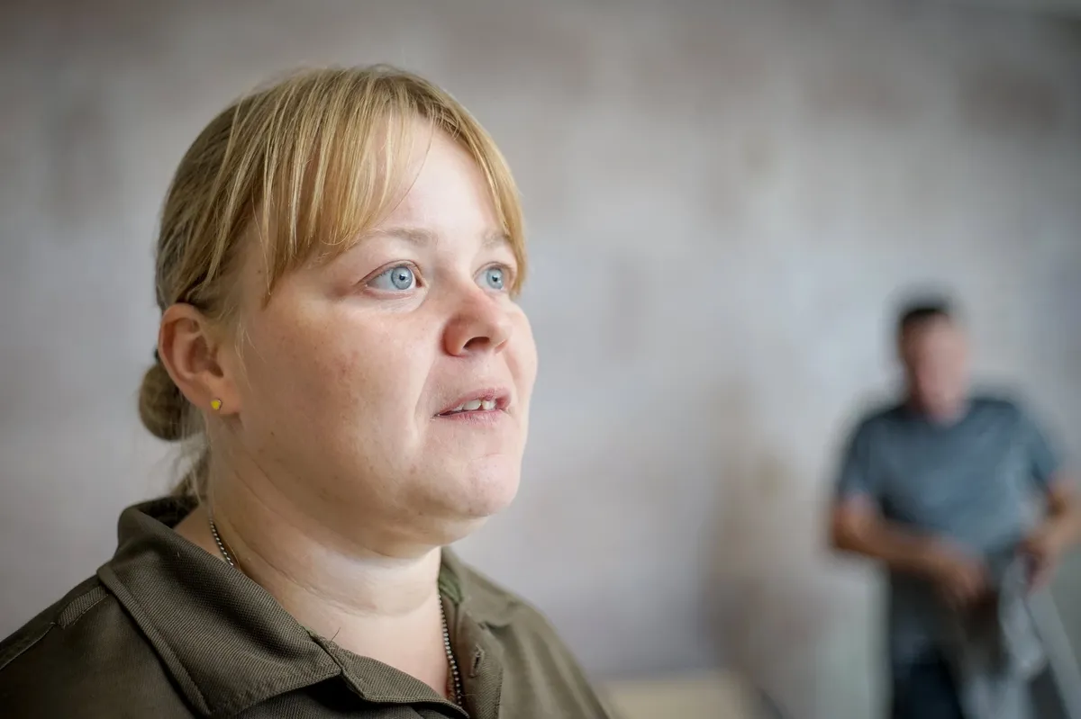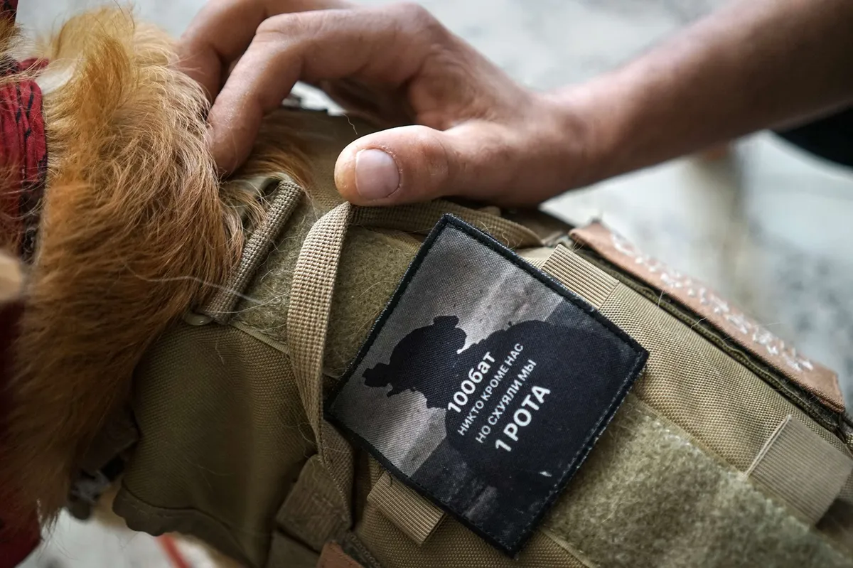 Он цепляет на ее жилет шеврон с понятным в военное время слоганом, полным черного юмора. Если попробовать его смягчить, там написано: «Кто, если не мы?» В каком-то смысле это относится и к самим собакам, выполняющим сложную, изматывающую работу.