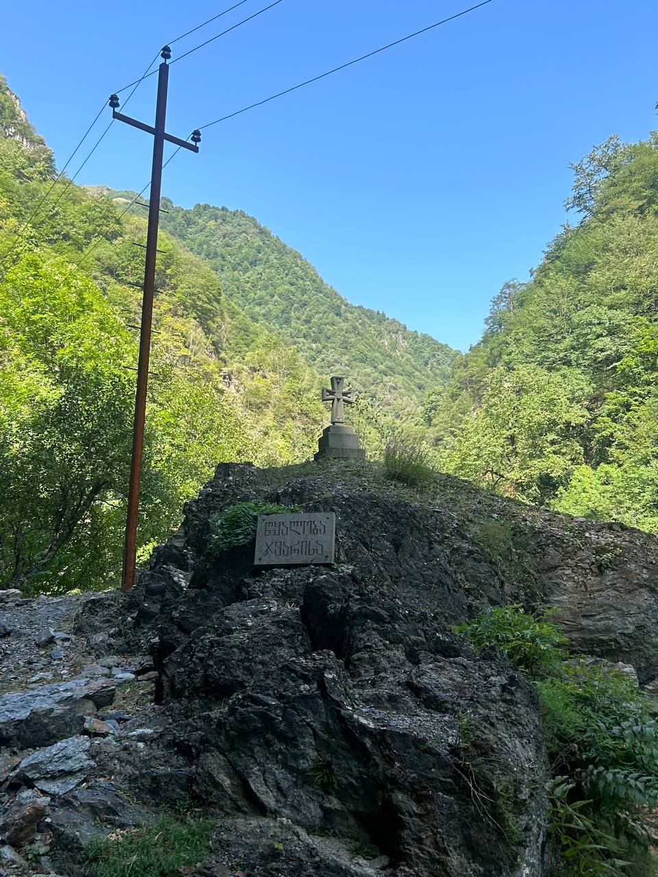 «Дорогой смерти» называется отрезок пути от Пшавели до Омало через перевал Абано. Это очень сложный маршрут с большим количеством могильных крестиков по пути. В начале мы даже видели труп в пакете около разбитого мотоцикла — сразу стало понятно, что дорога называется так неспроста.