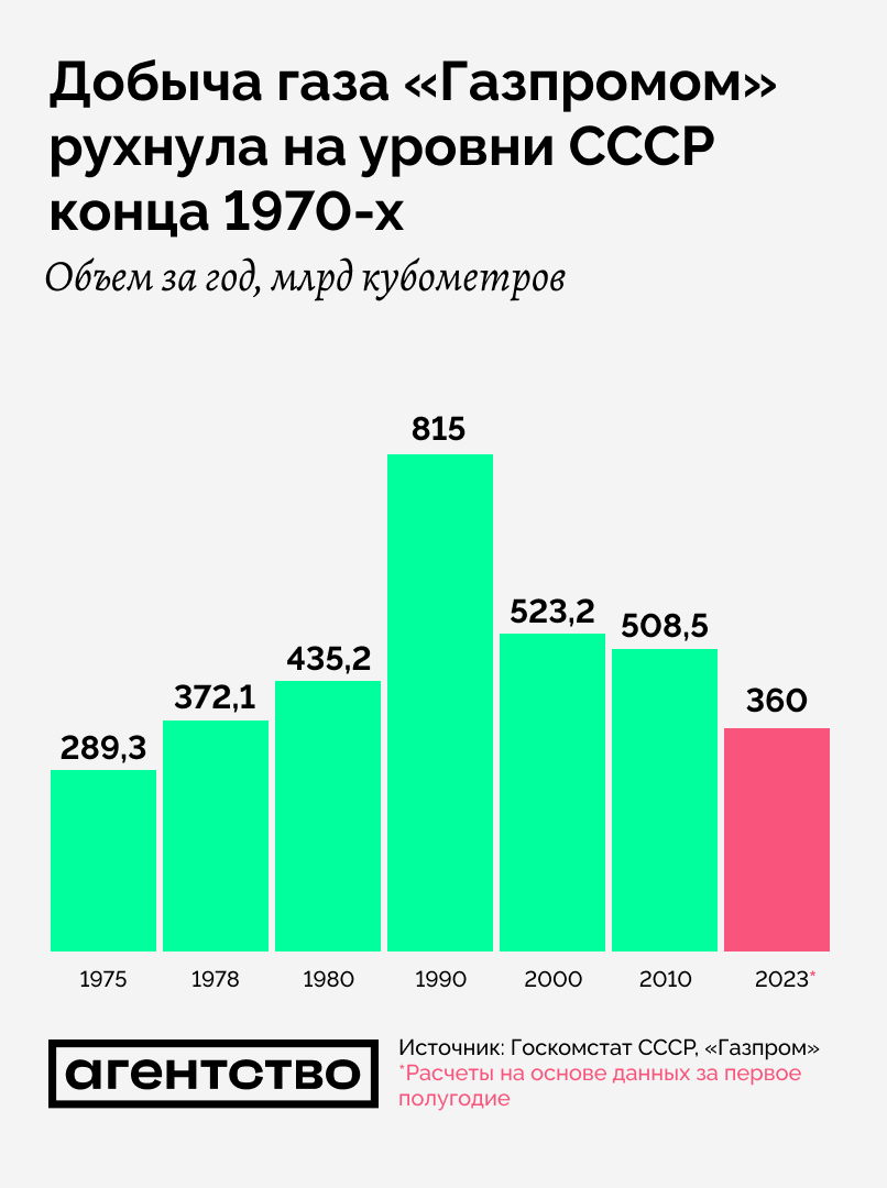 «Газпром» отчитался о сокращении добычи газа в первом полугодии 2023 года до 179,45 млрд кубометров. Таким образом годовая добыча может составить около 360 млрд кубометров. Похожие объемы были в СССР в 1970-е годы.
