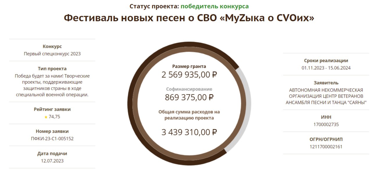 Президентский фонд культурных инициатив (ПФКИ) 28 сентября объявил победителей специального конкурса 2023 года в области культуры, искусства и креативных индустрий, распределив 1,6 млрд рублей между патриотическими и провоенными проектами. Грантами поддержали инициативы Олега Газманова, Ирины Винер-Усмановой и Ильи Авербуха. Среди самых дорогих провоенных проектов, согласно анализу «Агентства», оказались сериал про Запорожскую АЭС (49 млн рублей), открытие продюсерского центра женой ведущего «Первого канала» Руслана Осташко (23 млн рублей) и спектакль «Сестры» о женах военных (17 млн рублей).