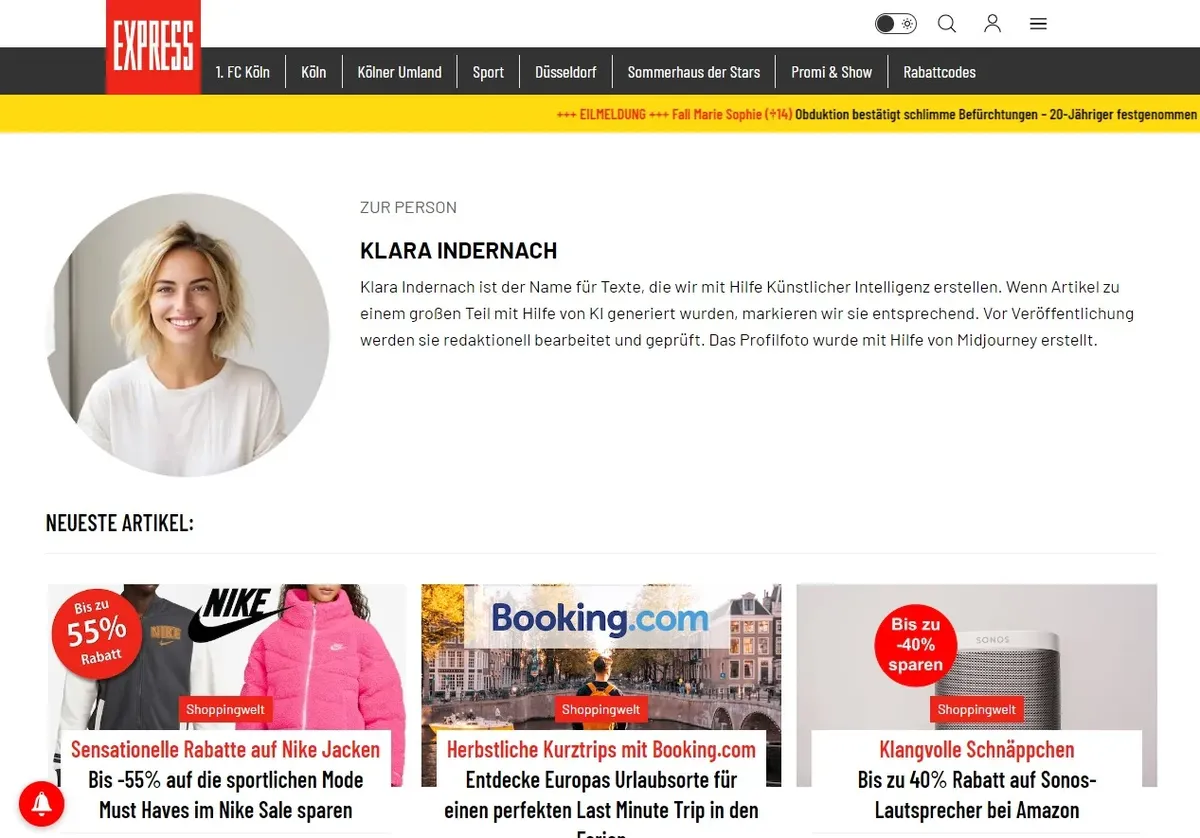 В газете Express, выходящей в Кёльне, много и о разном пишет автор Клара Индернах. На странице авторов находим ее фотографию, это молодая блондинка с сияющей улыбкой. Рядом с ее именем и фамилией стоит KI — естественно предположить, что это ее инициалы. Но на самом деле KI означает Künstliche Intelligenz, а фото девушки, за которую выдает себя работающий в газете искусственный интеллект, создано другим искусственным интеллектом, специализирующимся на генерации изображений (Midjorney).