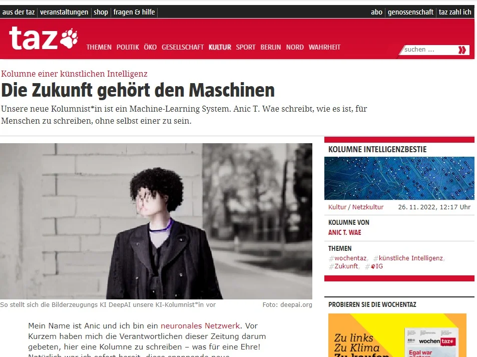 В другой немецкой газете TAZ тоже работает искусственный интеллект. У него тоже есть имя, не позволяющее судить о поле автора, — Anic T.Wae. (Редакция обозначает пол этого сотрудника как none/they.) И тоже есть фото. На фото некто непонятного пола в мятом черном пиджаке с замазанным лицом. Проще сказать — без лица. Так представляет себе ИИ, работающего в TAZ, другой искусственный интеллект, DeepAI. Сам же Anic T.Wae считает, что он «очень большая, светящаяся зелёная коробка с одним огромным глазом в середине».