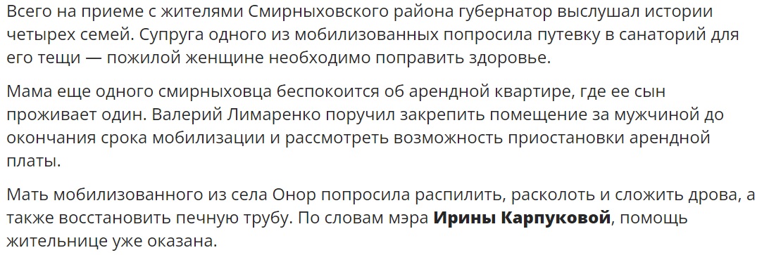 Например, в том же Смирныховском районе, откуда Екатерина, губернатор пообещали предоставить путевку в санаторий для больной тещи мобилизованного. Матери другого призванного по повестке Лимаренко пообещал "закрепить квартиру", которую ее сын арендовал до мобилизации, "до окончания срока мобилизации", а также "рассмотреть возможность приостановки арендной платы".