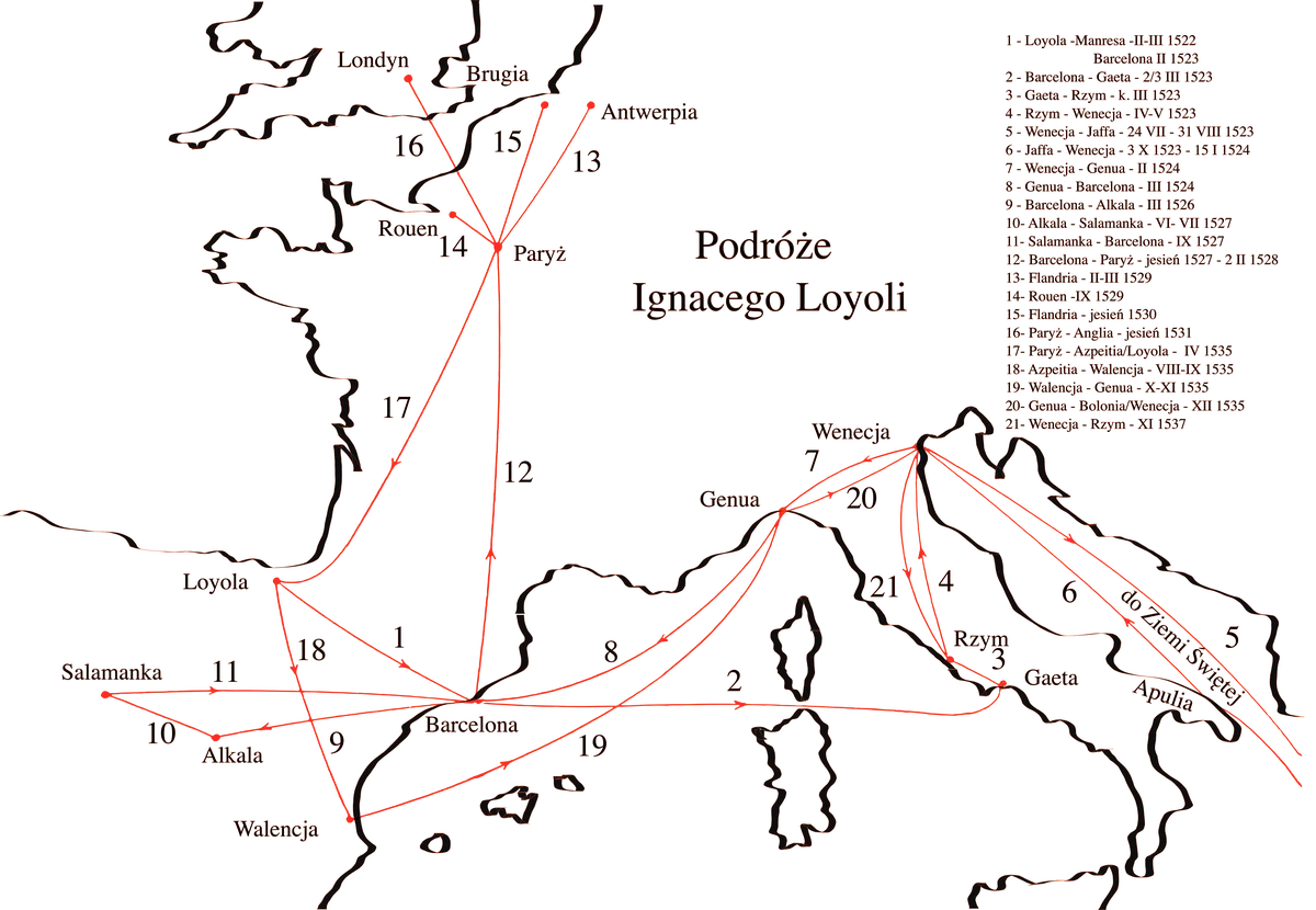 Следующим этапом было посещение Рима, аудиенция у папы римского, благословение на паломничество в Иерусалим. Там паломников встретили францисканцы, которые и водили их по Иерусалиму, Вифлеему и Иордану. В конце «тура» Лойола выразил желание остаться в ордене, но ему было отказано из-за… малограмотности. Иньиго возвращается в Испанию, где два года изучает латынь. Почувствовав, что знает язык достаточно, чтобы понимать лекции в университете, Лойола отправляется в университет в Алькале.