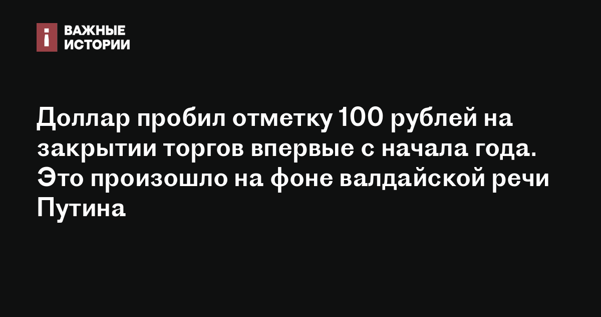 Доллар пробил отметку 100 рублей на закрытии торгов впервые с начала года. Это произошло на фоне валдайской речи Путина
