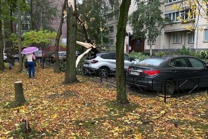 В частности, одно дерево упало на автомобиль на Долгоозерной улице, из-за чего крыша машины сильно прогнулась, пишет телеграм-канал «Мегаполис». Другое дерево рухнуло на улице Маршала Говорова, заблокировав движение.