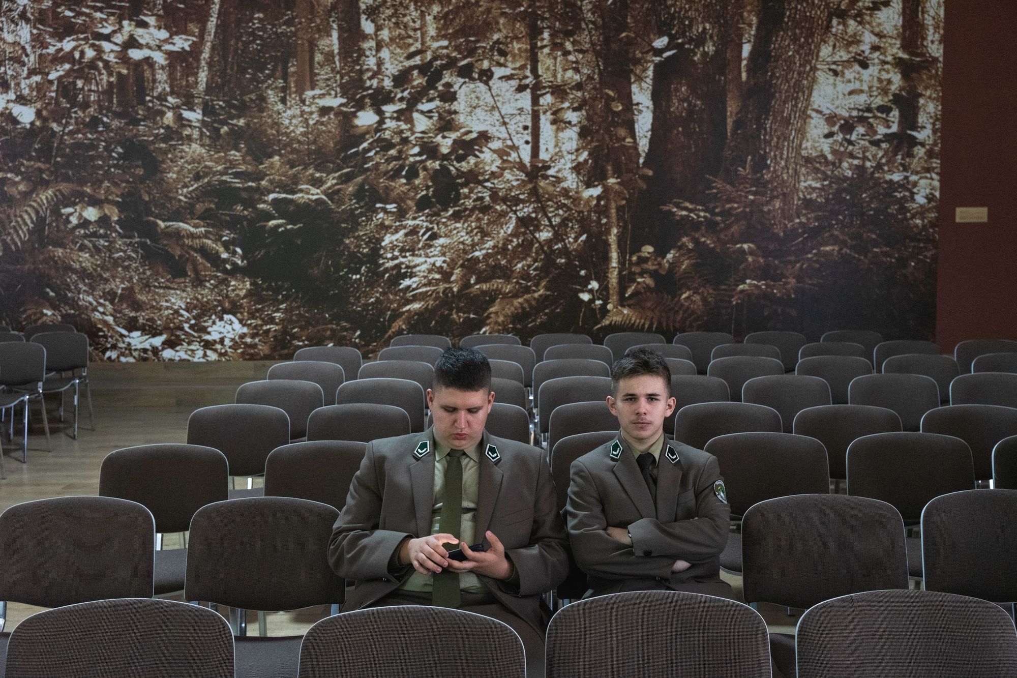 Some of my encounters were spontaneous, while others were planned in advance. For instance, I photographed two young boys I ran into who were studying at a forestry school near the border. They were busy preparing for a performance in the school theater, with forestry posters completely covering the wall behind them. I realized that the forest, which enveloped everything in the area, might be the common thread connecting everyone. It seemed like everyone somehow had a connection with the forest and that this would allow me to connect the different stories.