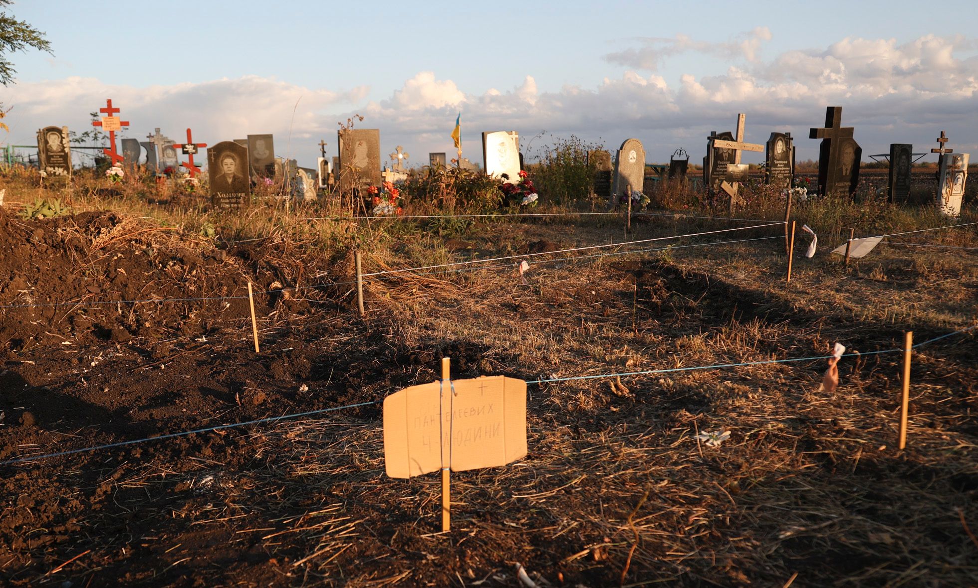 Yakiv Lyashenko / EPA / Scanpix / LETA Вид на кладбище в селе Гроза с временными ограждениями для будущих могил. На переднем плане табличка с участком для захоронения четырех человек из семьи Пантелеевых, погибших в результате удара