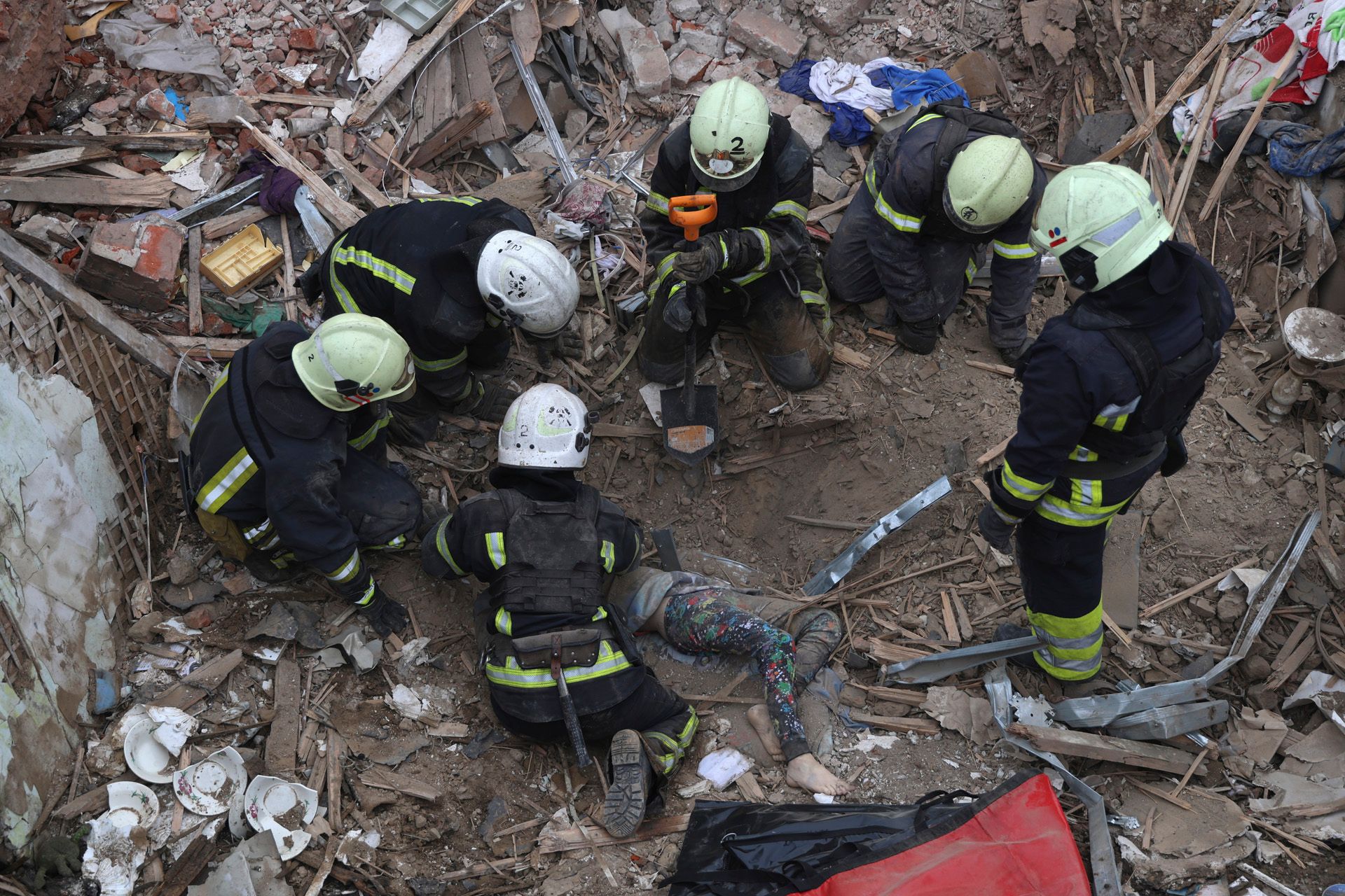 Alex Babenko / AP / Scanpix / LETA Спасатели извлекают из-под завалов тело 10-летнего мальчика, который стал жертвой удара по Харькову 6 октября