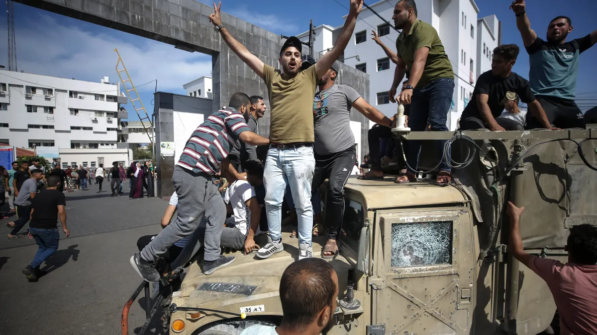 Палестинцы, захватившие израильский военный автомобиль, Газа, 7 октября 2023 года. Фото: EPA-EFE / HAITHAM IMAD