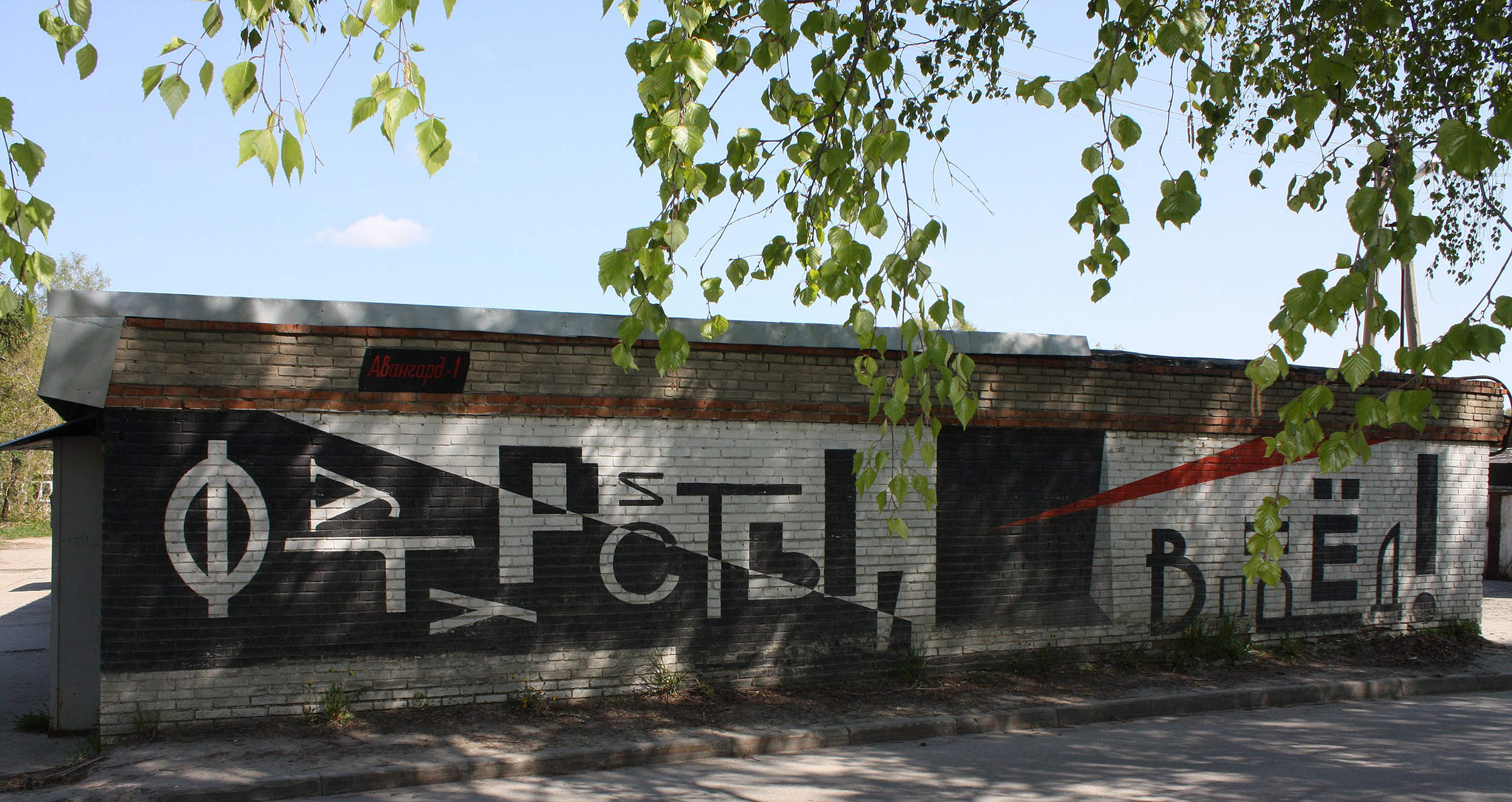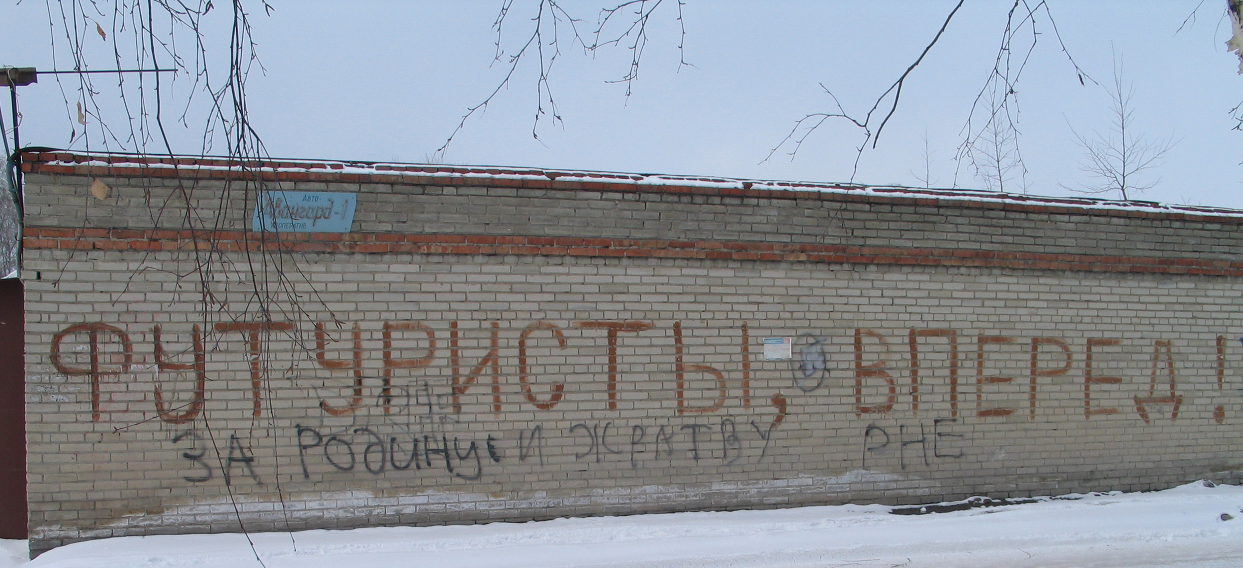 А ведь мимо гаража, на стене которого пузырилась вся эта дискурсивная муть, ходил живой Виктор Iванiв, один из самых ярких и оригинальных продолжателей футуризма в новейшей русской литературе, лауреат главной русской литературной премии – имени Андрея Белого (материальное содержание один рубль), автор десятка книг тиражом от трехсот до тысячи экземпляров каждая (таким же тиражом сейчас в Москве медленно выходит собрание сочинений). Ходил, пока не вышел из окна в 2015-м – от собственного внутреннего разлома, разумеется, но и от неуслышанности. Потому что производство смыслов, тем более производство смыслов для будущего, будь то художественных, философских или идеологических, требует сложно настроенной системы трансляторов, передающих интеллектуальные и эстетические события в более широкие слои общества. Если эта система не построена и/или умышленно разрушена, то культура высших ценностей и культура повседневности перестают встречаться друг с другом. Или встречаются, но ценой превращения события в декорацию, элемент оформления – как и случилось со стеной гаража "Авангард" в аккурат в 2014 году, по случаю сочинской Олимпиады, Донецка и Луганска: собрались профессионалы, сделали проект да и покрасили стену в рамках фестиваля современного искусства "Арт-Тайга". И теперь надпись "Футуристы, вперед!" зовет неизвестно кого неизвестно куда уже в художественно выверенном виде, с пляшущими буквами футуриста Ильязда и красным клином футуриста Лисицкого: отличное решение для современного городского дизайна.