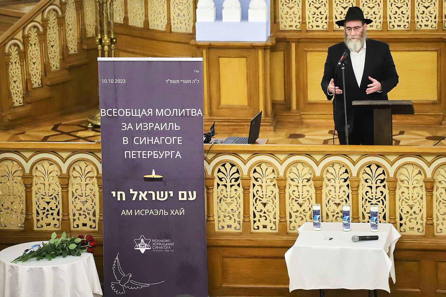 В Большой Хоральной Синагоге Петербурга 10 октября, на четвертый день после атаки ХАМАС, провели молитву за благополучие Израиля: «за то, чтобы раненые выздоровели, пропавшие нашлись» и чтобы израильский народ смог «выстоять и победить врагов». «Бумага» показывает, как это было.