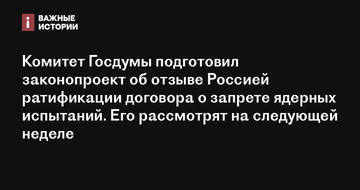 Комитет Госдумы подготовил законопроект об отзыве Россией ратификации договора о запрете ядерных испытаний. Его рассмотрят на следующей неделе
