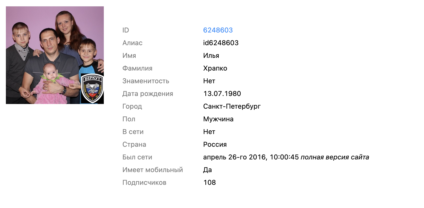Сейчас страница Ильи Храпко «ВКонтакте» удалена. Ее удалили между 16 августа и 3 сентября. На аватарки в разное время он ставил семейное фото с прифотошопленным шевроном отряда спецназа МВД ДНР «Беркут», картинку с силуэтом вооруженного человека и надписью «Вежливые люди», изображение шеврона «ЧВК Вагнера».