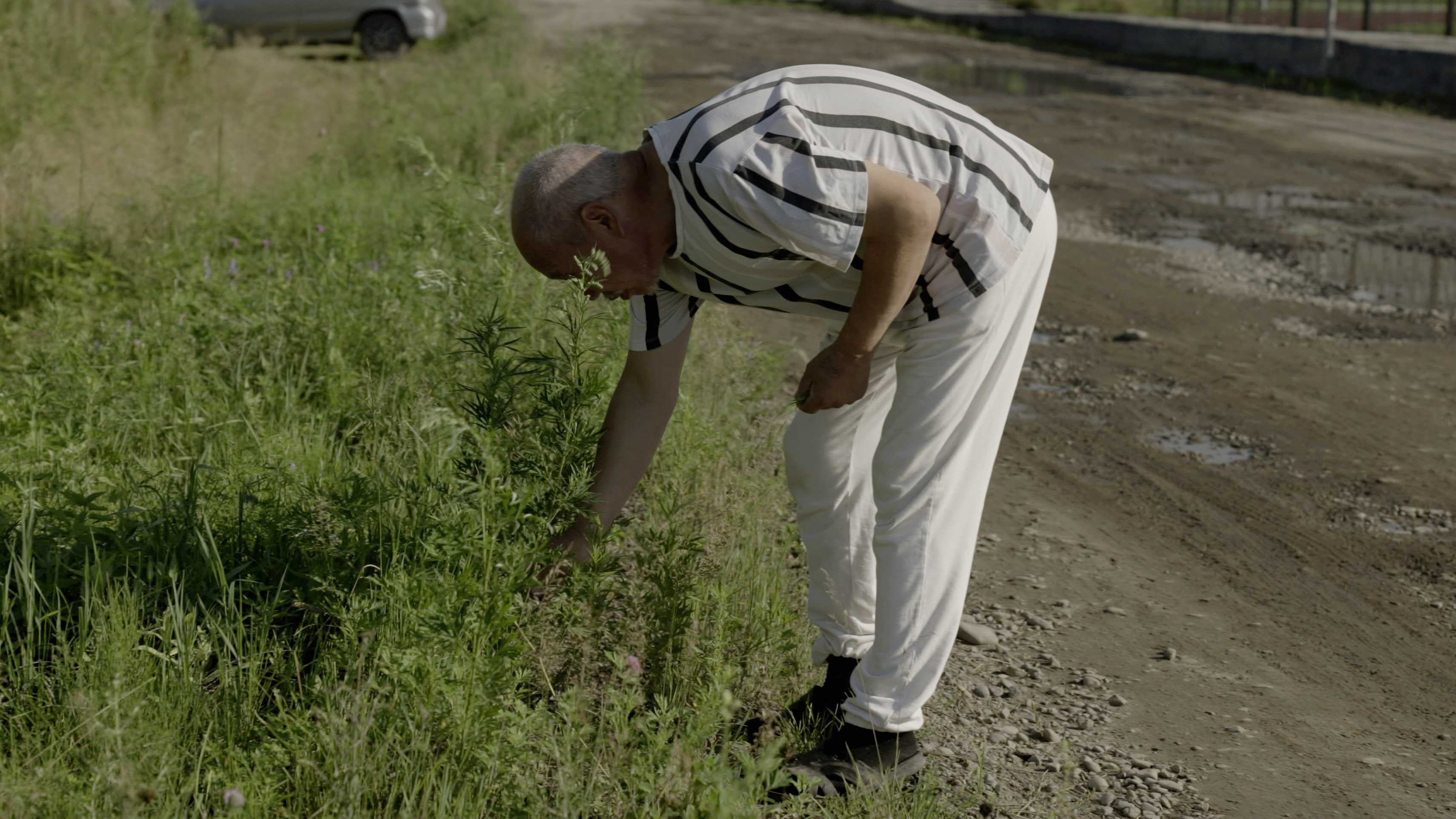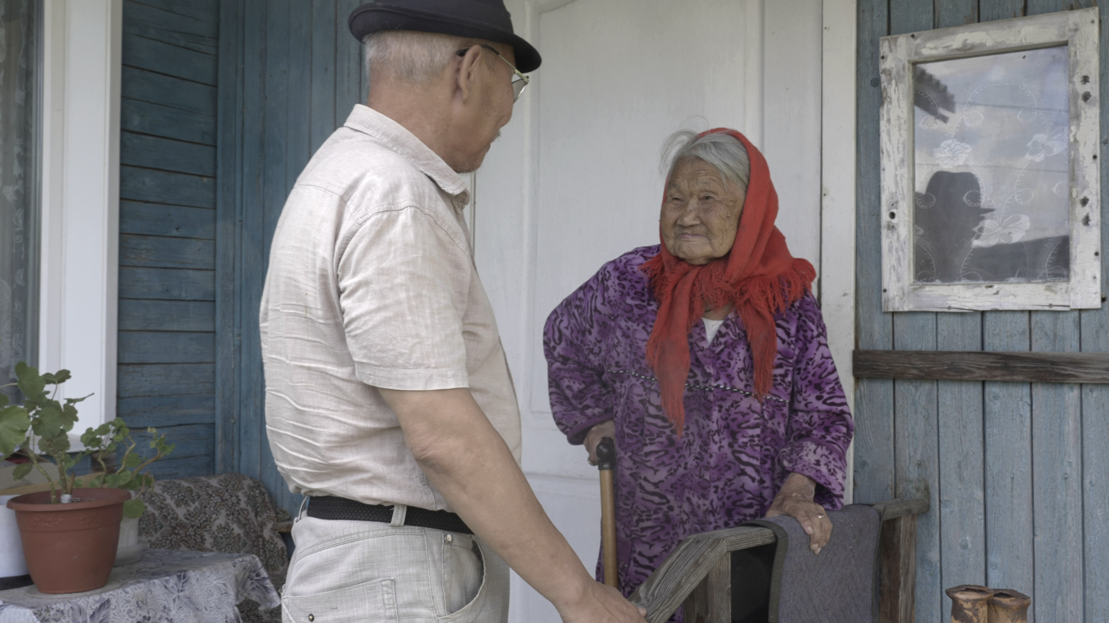 Когда он уезжает, вслед машине долго смотрит самая старая жительница села, живущая неподалеку. Она греется на крыльце, надвинув на глаза красный платок, и гладит котенка, привязанного для верности за веревочку. Старушка прожила почти сто лет, но ясно помнит только войну: