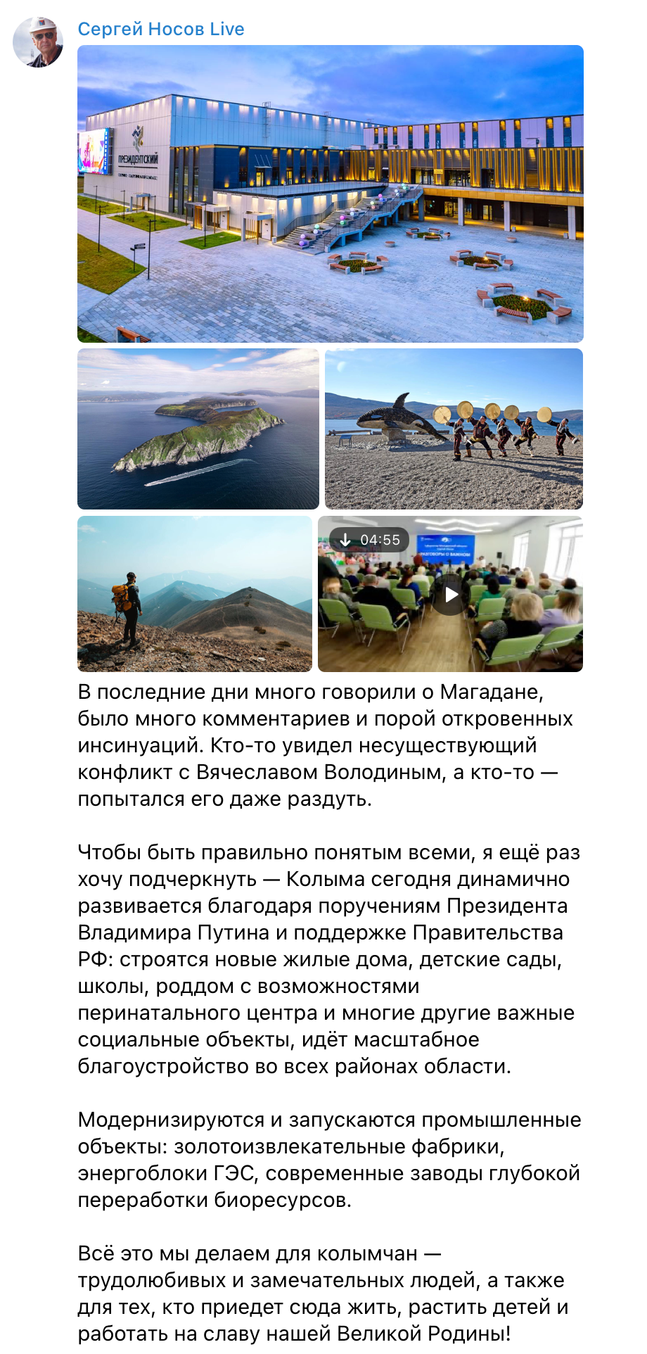 Чтобы быть правильно понятым всеми, я еще раз хочу подчеркнуть — Колыма сегодня динамично развивается благодаря поручениям Президента Владимира Путина и поддержке Правительства РФ.