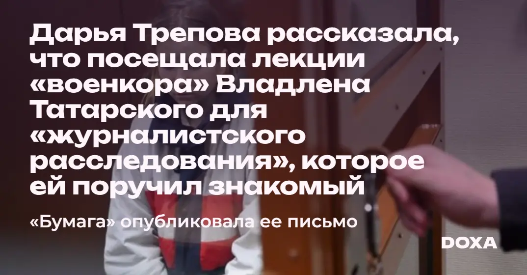 Дарья Трепова рассказала, что посещала лекции «военкора» Владлена Татарского для «журналистского расследования», которое ей поручил знакомый. Издание «Бумага» опубликовало письмо Дарьи из СИЗО