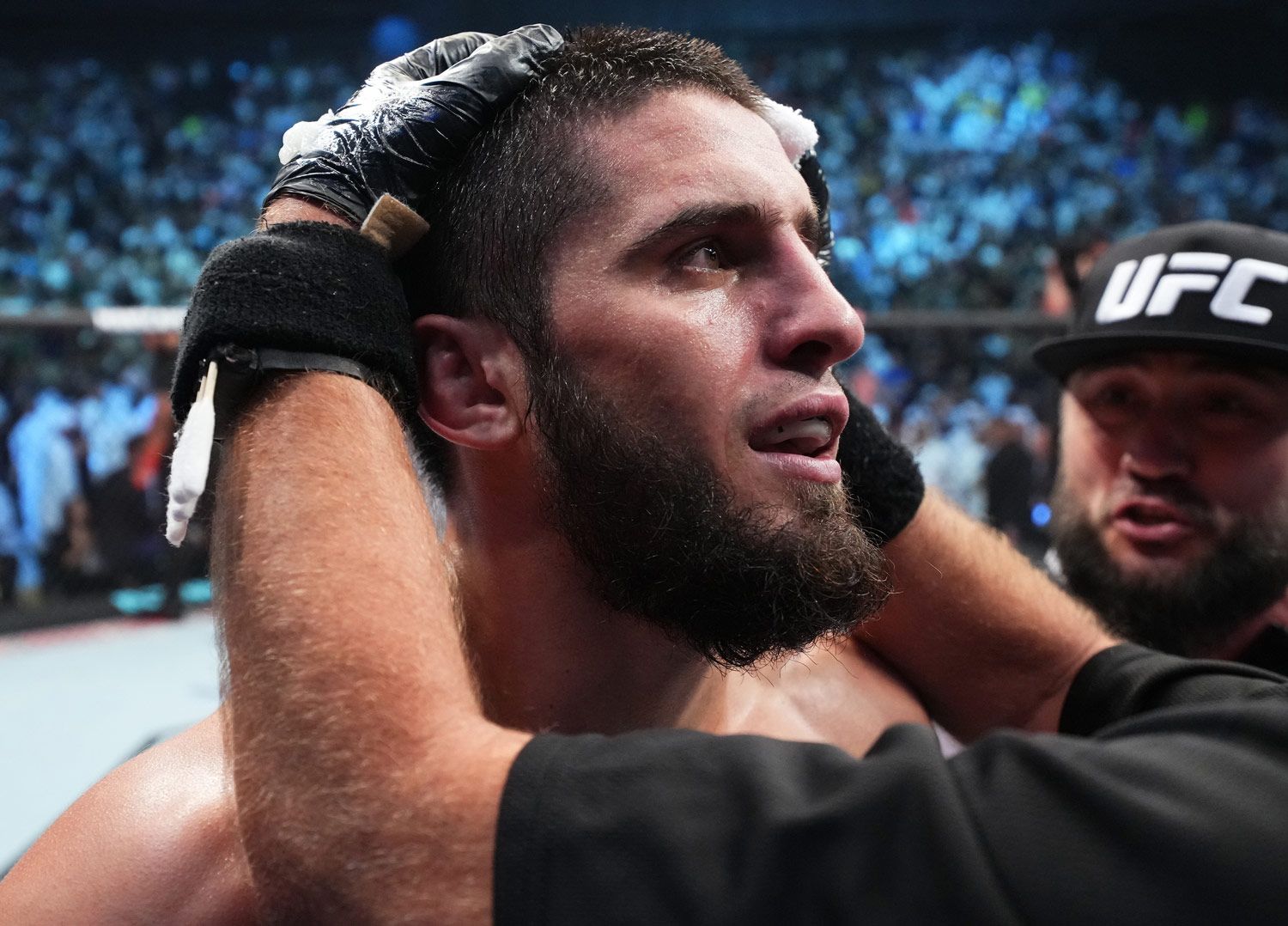 На замену вышел Камару Усман — американский боец нигерийского происхождения, который долгое время был чемпионом UFC в полусреднем весе (до 77,1 килограмма) и считался чуть ли не сильнейшим атлетом организации. Усман тоже приезжал в Чечню — в 2021-м он поздравил с днем рождения Адама Кадырова и поспарринговал с ним (такой опыт есть и у Чимаева).