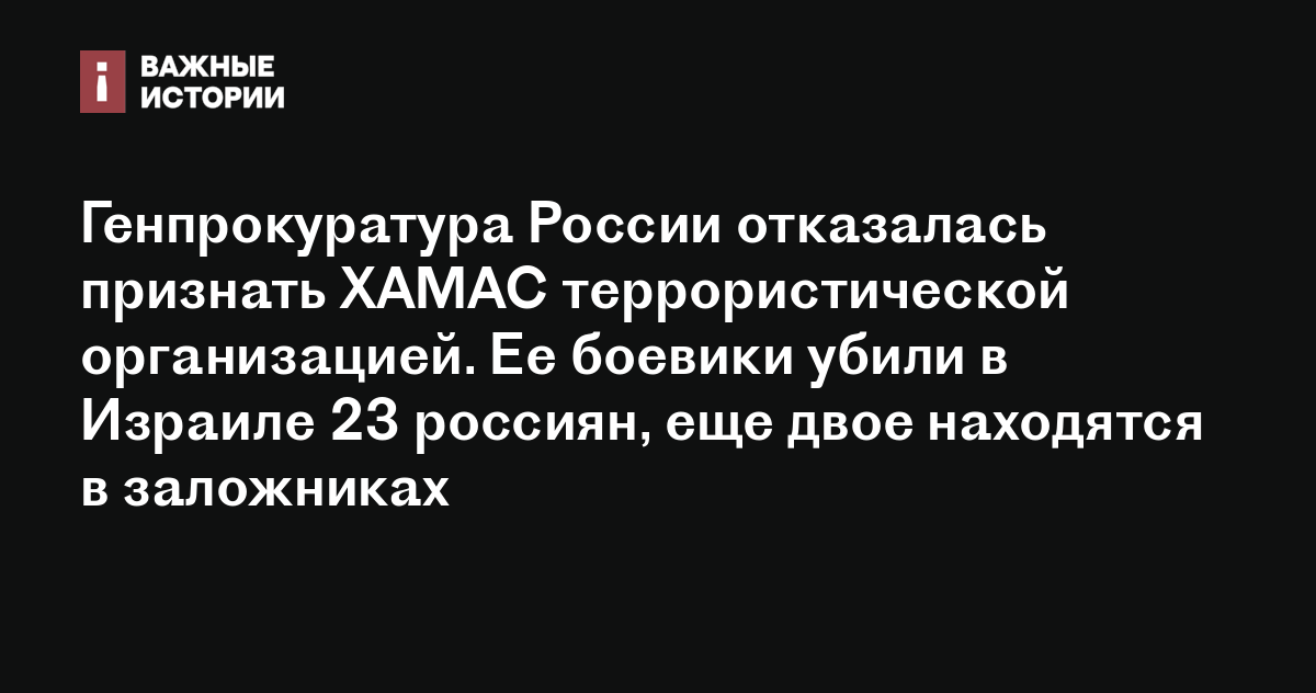 Генпрокуратура России отказалась признать ХАМАС террористической организацией. Ее боевики убили в Израиле 23 россиян, еще двое находятся в заложниках