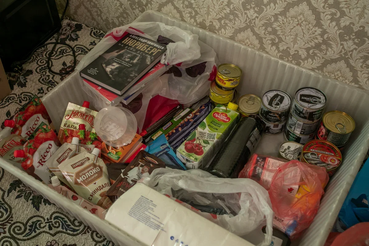 The sofa in the living room is now taken up by a large box containing medicine, food and books to be sent to Yegor at the detention centre. “Last time we handed over 15 packages,” Daniel says. “But we always give much more because we know that Yegor will share the contents with everyone.”