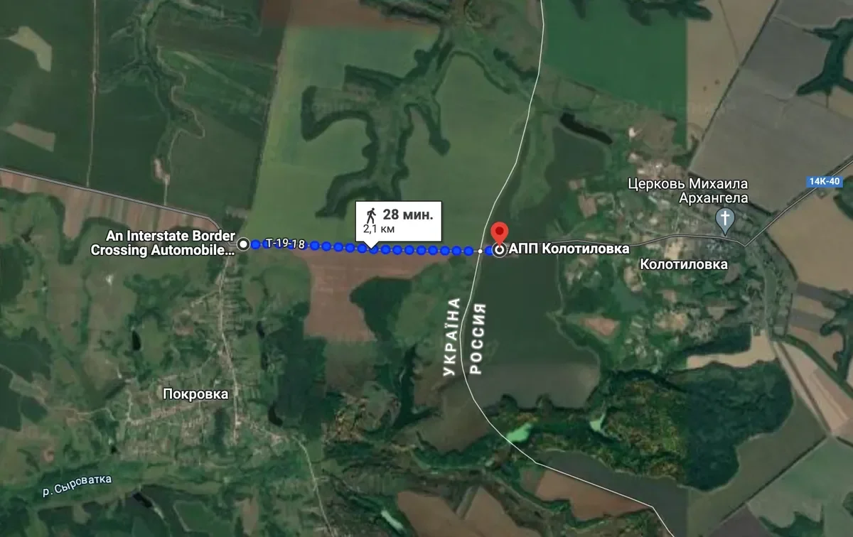 A 2-kilometre gravel road separates the Ukrainian checkpoint at Pokrovka in the Sumy region from the Russian checkpoint at Kolotilovka in the Belgorod region. The only way across is on foot, which takes 40 minutes even without luggage, but can take well over an hour for those carrying lots of their belongings or helping others across. “You can’t expect anyone to help,” one person who recently made the crossing said, adding “on this road it’s everyone for themselves”.