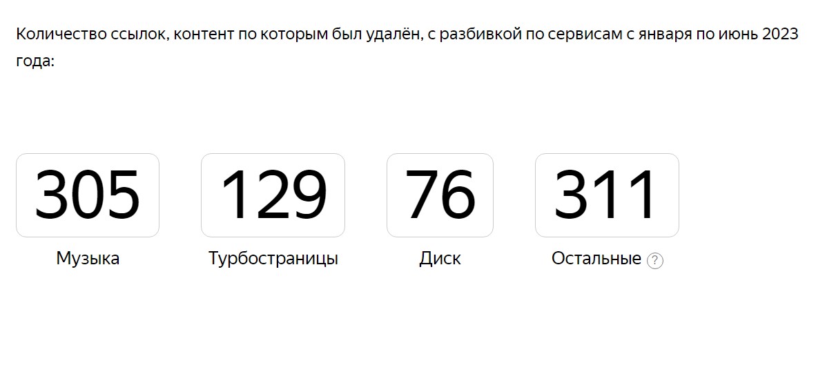 Помимо этого, Роскомнадзор требует о компании также удалять ссылки на запрещенный контент — например, в сервисах «Яндекс Музыка» и «Яндекс Кью». Среди такого контента — музыка и подкасты, турбостраницы и сохраненные копии сайтов.