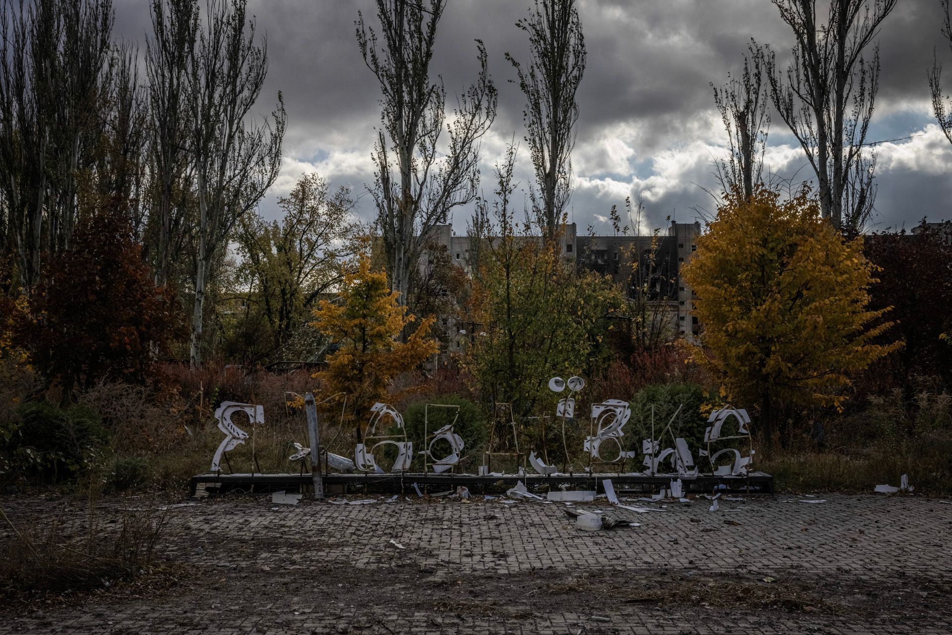 «Я ❤️ Авдеевку». Эту надпись больше не разобрать: она разрушена войной, а вместо знака сердца теперь артиллерийский снаряд