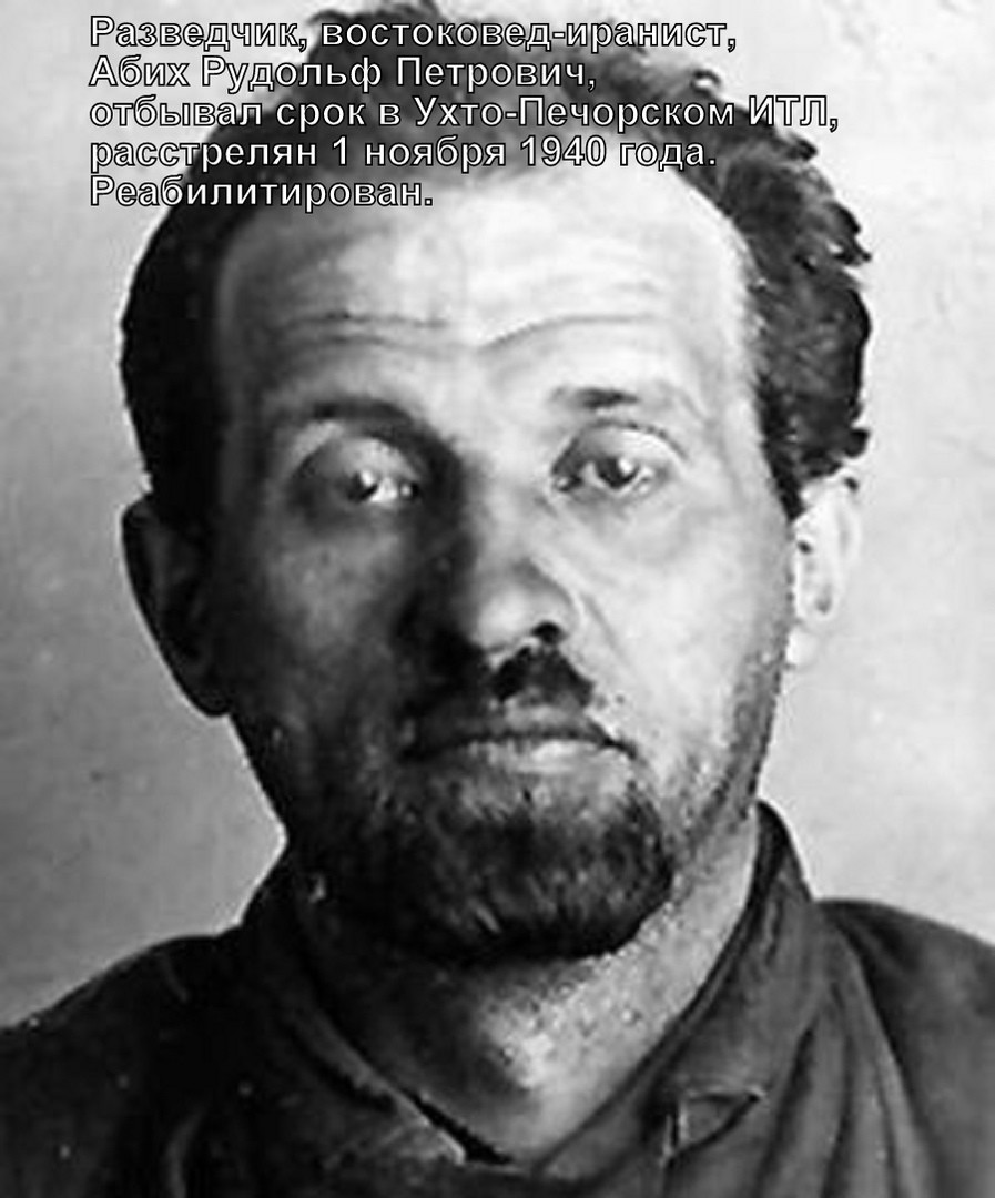 Революционер, участник социал-демократического кружка «Вперед», член РКП(б) с 1918 года Рудольф Абих неоднократно арестовывался большевиками за принадлежность к оппозиции. Однако это не помешало ему стать советским разведчиком и работать под легальным прикрытием в Иране. Последний его арест произошел в 1936 году. Особое совещание при НКВД приговорило Рудольфа Петровича к пяти годам лагерей за контрреволюционную деятельность и отправило отбывать наказание в Ухтпечлаг. В 1939 году его этапировали в Москву, обвинили в шпионаже и вынесли новый приговор – расстрел. В 1940 году приговор привели в исполнение.