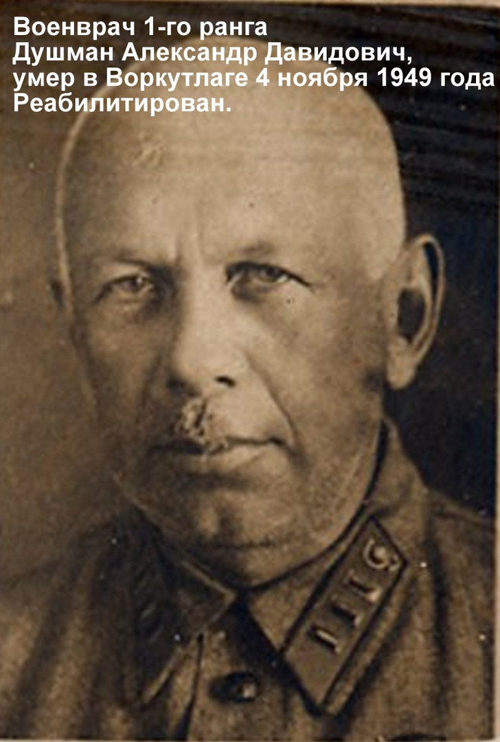 Военврач 1 ранга Александр Душман в годы гражданской войны был награжден орденом Красного знамени. Накануне ареста в 1937 году работал начальником санчасти командного факультета Государственного центрального института физкультуры. В 1938 году был осужден Военной коллегией Верховного суда СССР по ст. 58-6 УК РСФСР (шпионаж) на 12 лет ИТЛ. Отбывал наказание в Воркутлаге, где и скончался за несколько месяцев до окончания срока наказания.