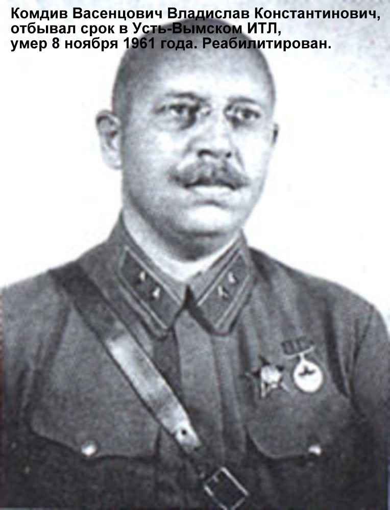 Участник гражданской войны, комдив Владислав Васенцович в первый раз был арестован в 1938 году по обвинению в шпионаже, вредительстве и участии в военном заговоре, но освободили за недоказанностью обвинений. Во второй раз его арестовали по прежним обвинениям 15 февраля 1941 года и приговорили к 15 годам лишения свободы. Наказание отбывал в Устьвымлаге. После освобождения направлен в ссылку, которую отбывал в Зубово-Полянском доме инвалидов. Умер в Москве в звании «полковник в отставке».