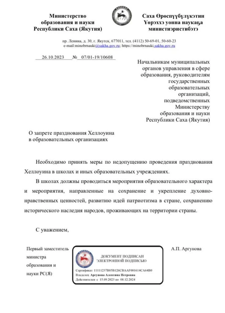 26 октября первый замминистра образования и науки Якутии Алевтина Аргунова написала письмо в якутские школы, в котором рекомендовала вместо западного Хеллоуина проводить «мероприятия, направленные на сохранение и укрепление духовно-нравственных ценностей». В пресс-службе региона сообщили, что «в свете последних событий руководство Министерства образования и науки Якутии считает нецелесообразным праздновать» Хеллоуин.