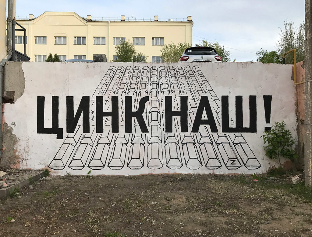 С самого начала было понятно, что вся эта военная авантюра не будет легкой прогулкой и украинцы будут себя защищать и справедливо отстаивать свою землю и свободу. У меня возникла идея антивоенной работы, которая передала бы ужас от ожидаемо большого количества погибших даже со стороны России. Так появилась работа «Цинк наш!», которую я сделал 9 мая, в сакральную для Путина дату, в сакральном для него месте — в Волгограде — и задействуя сакральный для него слоган.