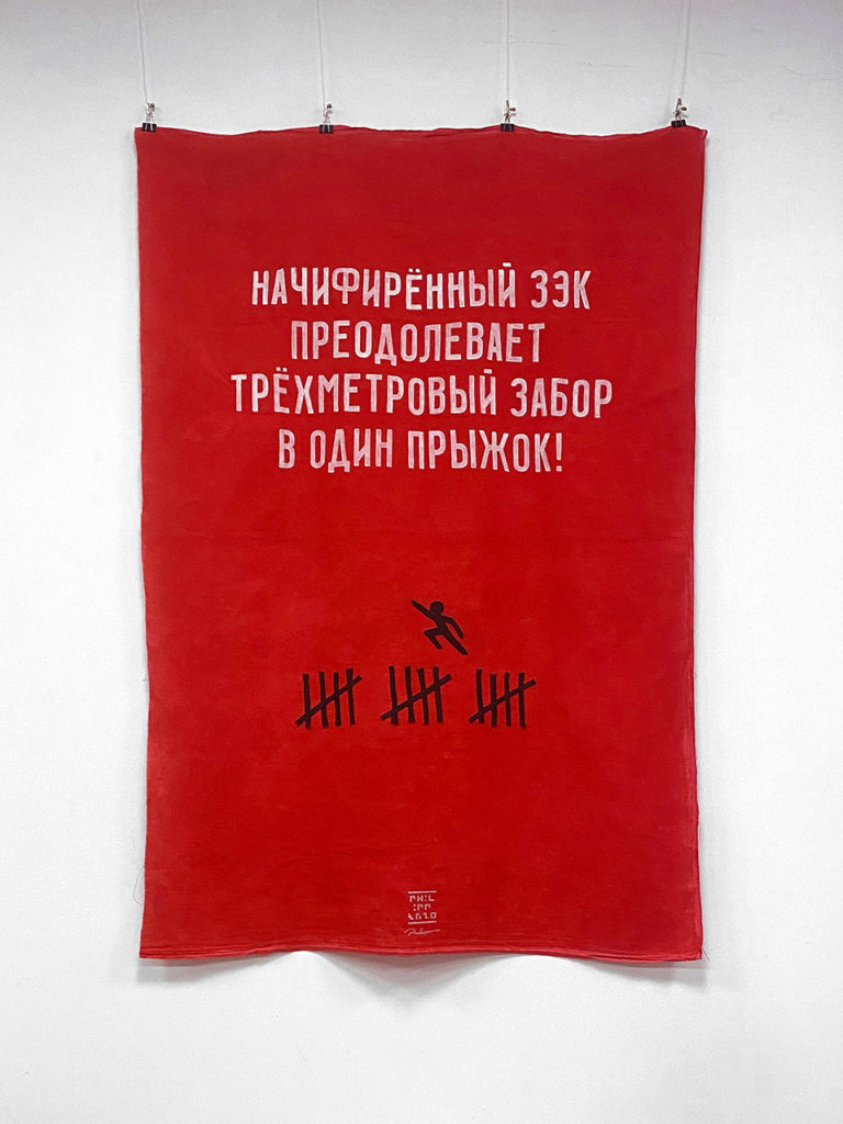 Я очень вдохновился всей этой ситуацией: энергию противника, которая была направлена на то, чтобы меня наказать и удержать, я перевел в творчество. Я общался со своими сокамерниками с реальным тюремным опытом и пропитывался лагерной культурой. От них я услышал афоризм: «Начифиренный зэк преодолевает трехметровый забор в один прыжок» — и на красной тряпке написал его белым шрифтом. Нитками пришил черточки, которыми зеки отмечают дни, и заключенного, который перепрыгивает этот забор.