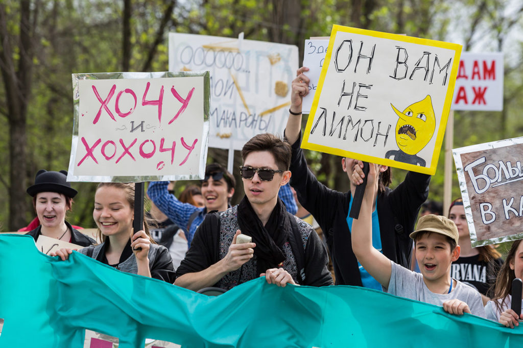 — Так случилось, что политизировалась жизнь вокруг и я сам как гражданин. Это случилось после наглых фальсификаций на выборах в 2011 году. Также в то время в России еще проводились «монстрации» (массовая акция в форме митинга, но с абсурдными лозунгами. — Прим. «Холода») — формат первомайских шествий с гротескными лозунгами, которым я увлекся. Это естественным образом повлияло на мое творчество. В тот момент я открыл в себе творческую чакру по придумыванию различных афористических лозунгов и высказываний, которые начал активно применять в своем творчестве. Без «монстрации» не было бы многих моих известных работ: «Озеро», «[ПОЦЕЛУИ]», «Молодость», «Цинк наш!» и «Изроссилование».