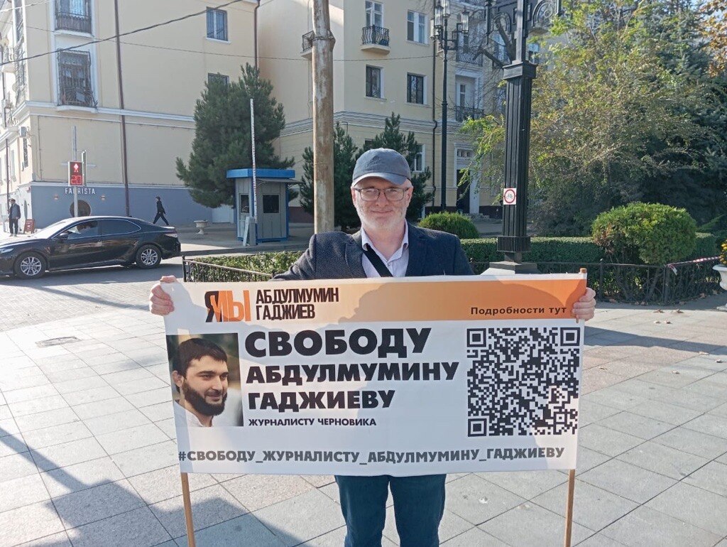 В Махачкале журналисты провели два одиночных пикета – с требованием освободить их коллегу, автора газеты "Черновик" Абдулмумина Гаджиева и в поддержку Палестины, сообщает корреспондент Кавказ.Реалии.