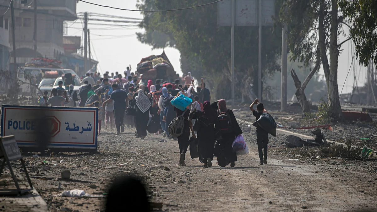 Жители эвакуируются из северной части сектора Газа пешком после очередного предупреждения Израиля в ходе активизации военных операций в северной части сектора Газа, 05 ноября 2023 г. Фото: Mohammed Saber / EPA