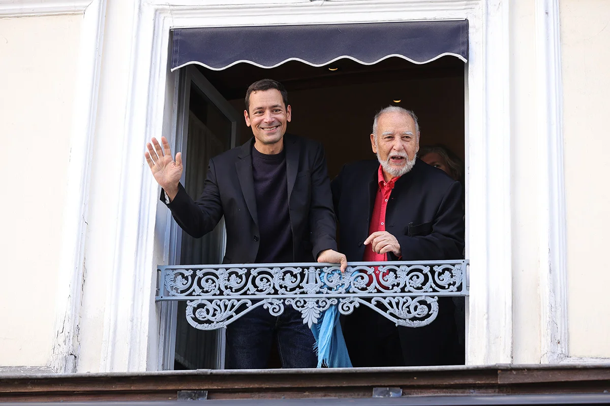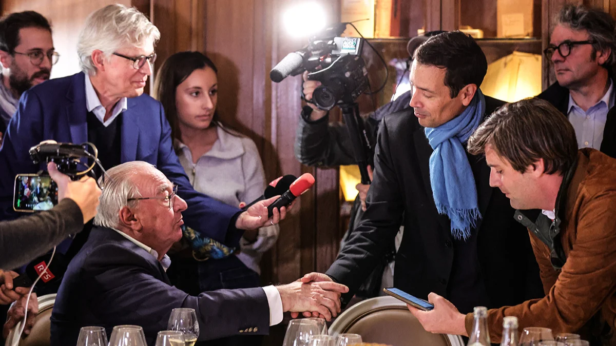Французский писатель Жан-Батист Андреа пожимает руку председателю жюри Гонкуровской премии Дидье Декуану в ресторане Drouant после получения Гонкуровской литературной премии 2023 года за книгу "Veiller sur elle" в Париже, Франция, 07 ноября 2023 года.