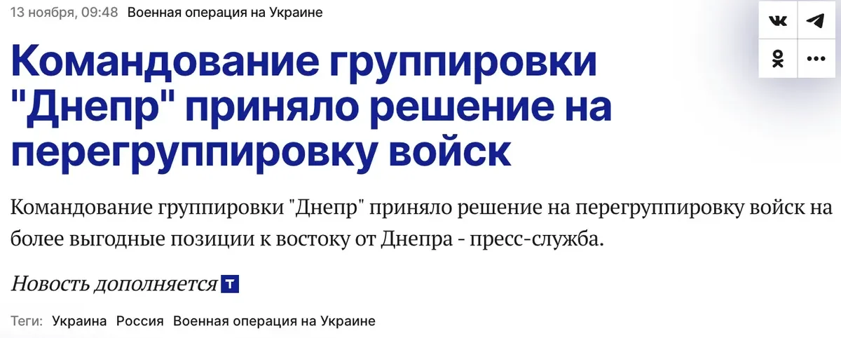 “Having assessed the current situation, the command of the Dnieper group decided to transfer troops to more advantageous positions east of the Dnieper. After the regrouping, the Dnieper group will release part of its forces to be used in an offensive,” the TASS report wrote.
