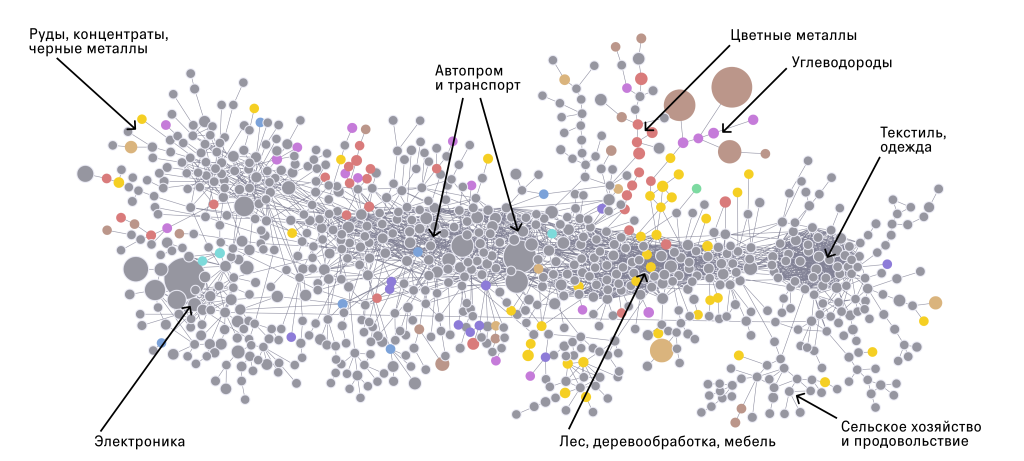 На этот вопрос можно посмотреть и с противоположной стороны: как выглядит в результате место экономики страны в глобальном разделении труда? Здесь я снова воспользуюсь помощью команды из Гарварда, которая визуально показала индустриальные кластеры и центры создания стоимости в мировой экономике. Если соответствующий кружок на «карте» производственных кластеров мировой экономики окрашен каким-то цветом, значит, экономика данной страны является экспортером соответствующей продукции. Если кружок не закрашен, значит, до этого еще не дошло.