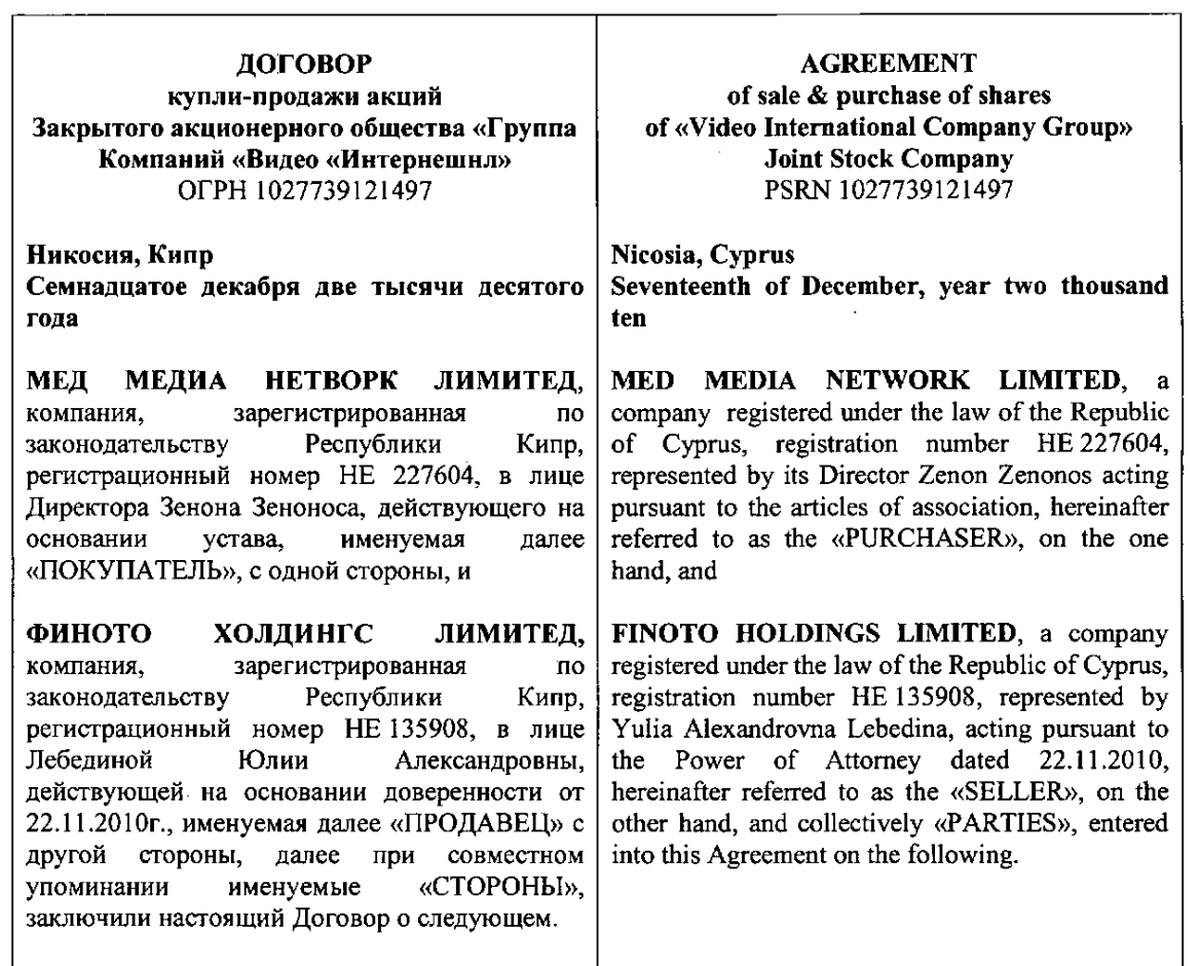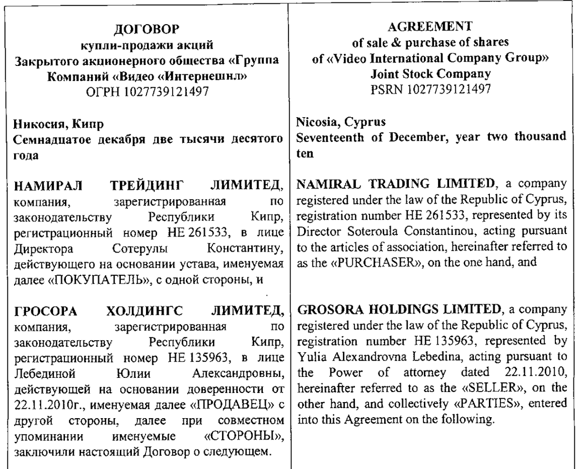 Документы кипрской утечки показывают, что в декабре 2010 года кипрские фирмы Finoto Holdings и Grosora Holdings продали 25% группы «Видео интернешнл» за 40 млн долларов. Покупателями стали Med Media Network и Namiral Trading тоже с Кипра, связанные с крестным отцом дочери Путина, виолончелистом Сергеем Ролдугиным — давним другом российского президента. Владельцем Med Media Network была его панамская фирма International Media Overseas, отмеченная в международном журналистском расследовании «Панамские файлы». А владельцем Namiral Trading числился Александр Плехов, предприниматель, близкий к основателю банка «Россия» Юрию Ковальчуку. Плехов в некоторых случаях действовал по доверенности от Ролдугина.