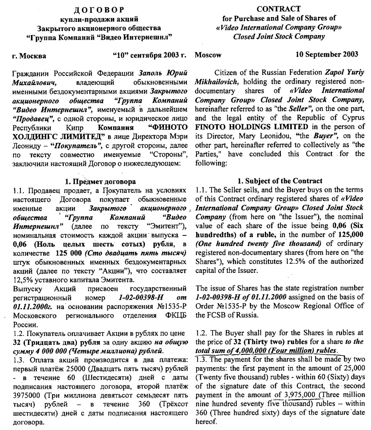 10 сентября 2003 года Заполь подписал два договора: по 12,5% «Видео интернешнл» были проданы кипрским компаниям Finoto Holdings и Grosora Holdings. Обе замыкались на офшорные фирмы, которыми владел Sara Trust Абрамовича.