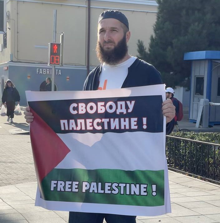 Журналист и гражданский активист Идрис Юсупов каждый день проводит пикет в Махачкале в поддержку Палестины. После захвата аэропорта в Дагестане, когда несколько сотен человек пытались найти пассажиров транзитного рейса из Тель-Авива, к Идрису пришли с обыском, однако он продолжает выходить на акции.