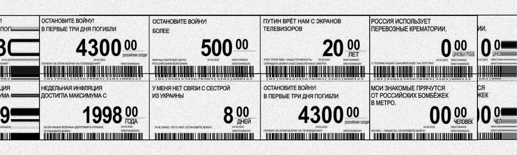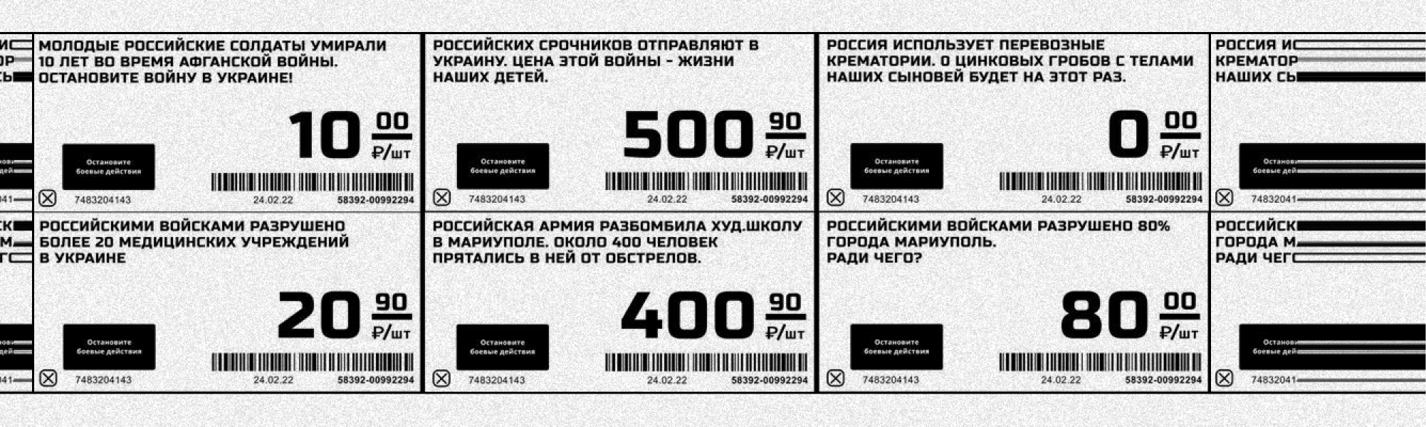 Antiwar stickers Skochilenko placed over grocery store products. The messages contain trivia about Russia’s invasion of Ukraine, such as “Russian troops have destroyed 80 percent of Mariupol” and “Russian troops have destroyed more than 20 medical facilities in Ukraine.”