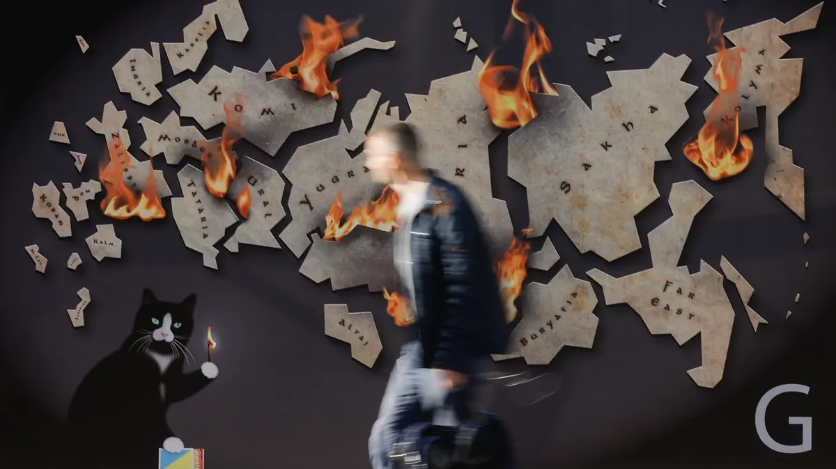 A man walks past a mural depicting Russia's break up in Kyiv. Photo: EPA-EFE / SERGEY DOLZHENKO